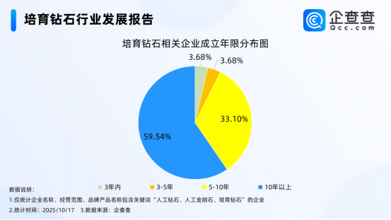 同一时期,培育钻石市场也在遇冷,根据贝恩咨询的《2025全球钻石报告》,培育钻石裸石市场规模大幅缩水52%,曾经火热的培育钻石裸石市场也光环不再。企查查显示,今新企业注册量显疲态,2024年仅新增15家,今年以来更是只有7家。国内现存873家培育钻石相关企业中,近六成已是成立10年以上的老牌企业。