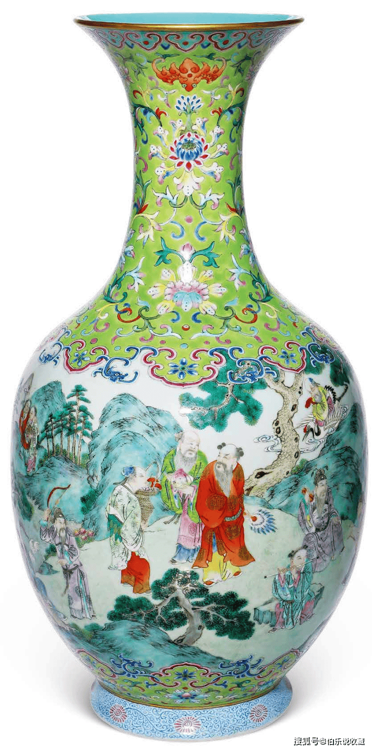 清嘉庆 粉彩绿地缠枝莲开光八仙祝寿人物长颈瓶