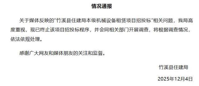 4日下午,竹溪县住建局发布通报,宣布终止该项目招投标程序,会同相关部门成立调查专班开展调查。此前该局负责人承认,这是工作重大失误,代理公司业务出错,自身监管也不到位。