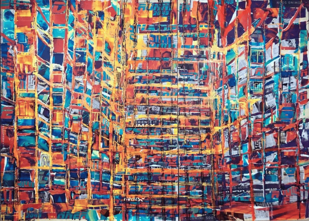 在这件作品中,王昊阳采用《银翼杀手 2049》电影海报的牛皮纸作为创作材料,将橙色调与蓝色调的海报撕碎后重新拼接。通过冷暖色调的碰撞,他营造出强烈的视觉张力。这幅作品的创作恰逢当时香港发生的社会性事件,使其在社会议题层面形成巧妙契合,隐喻他对未来底层人们生活状态的担忧与思考。