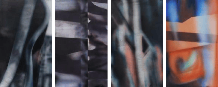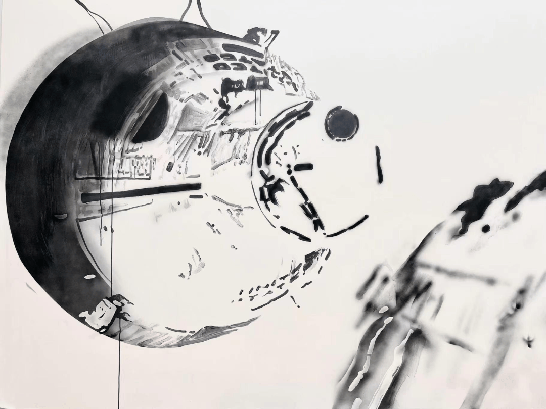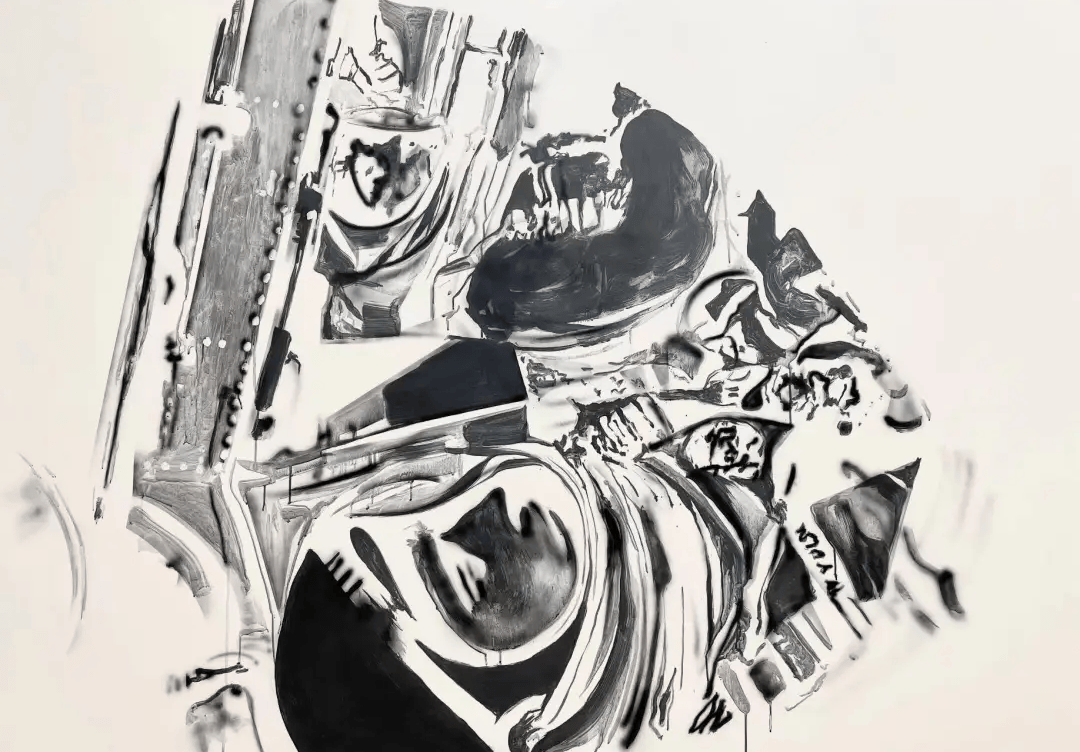 他将这些切片进行色彩反转,以喷枪结合画笔进行创作:局部用喷枪喷涂,细节用笔勾勒,形成类似单色照片的质感。该系列在视觉倾向上虽与其他作品有所不同,但保留了拼贴思维中图像抽离与重组的核心,唤起了观众对集体记忆的共鸣。