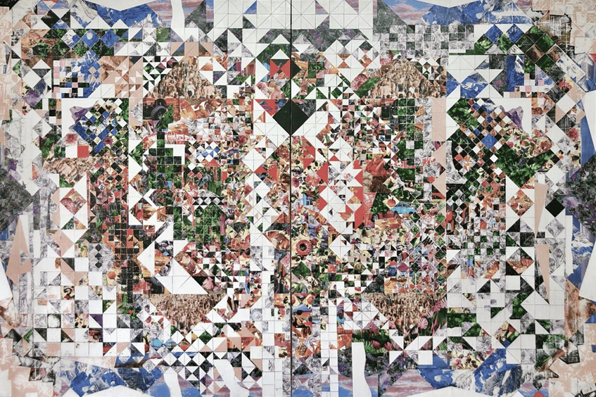 而大型拼贴作品《2049》则展现更宏大的创作视野,他将碎片化叙事与社会议题、科幻想象相结合。其直接致敬了美国黑人艺术家马克·布拉德福特同构图的作品,而灵感则源自科幻电影《银翼杀手2049》。布拉德福特对城市底层社会的关注,与《银翼杀手 2049》所描绘的“高科技低生活”赛博朋克式图景产生共鸣,而香港超高密度“鸽子笼”式的高楼照片,则将这种共鸣落地为具体的创作冲动。