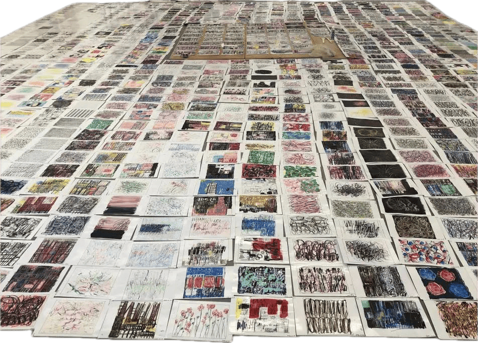 坚持日常速写小稿,是他维系创作状态的重要方式。读研期间,他为弥补“画面缺少基本视觉构成”的短板,以“每天十张、坚持三个月”的强度完成约1000张速写小稿,并将其整体铺陈于川大美术馆地面。这段训练使他养成主动关注画面构成的习惯,至今他仍保持每周完成一张详细草稿的节奏。这些铅笔画草稿为其正式创作提供了扎实的视觉基础。