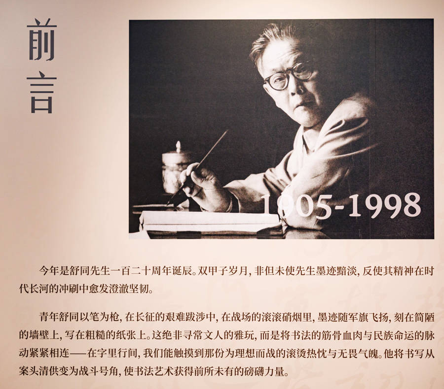 舒同先生是自成一体的书法大师,也是中国书法事业的继承者与开拓者,中国书协的首任主席。他5岁学书,14岁获“东乡才子”美誉,后临颜真卿、柳公权、何绍基等名家碑帖,创立独具特色的“舒体”,被毛泽东称为“马背书法家、党内一枝笔”。他与上海渊源深厚,这里是他工作和战斗过的地方,留下了华东师大、同济大学、华纺、华东化工、一医、二医、上财、上戏、上体、劳动报、青年报、上海站、上海展览中心等一批墨宝,其中“上海”二字已成为城市标志字体,上海也成为舒同体最为流行的地区之一。他的书法既汲取海派文化养分,也为海派书法发展注入活力,更以“为人民书写”为使命,与民族命运的脉动紧紧相连,纪念舒同极具历史意义和现实意义。