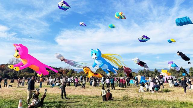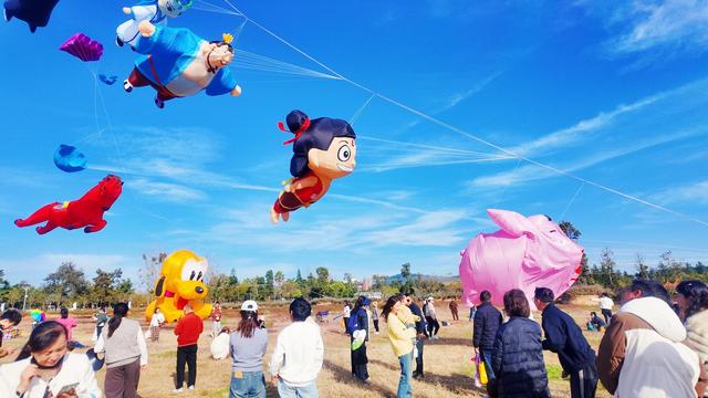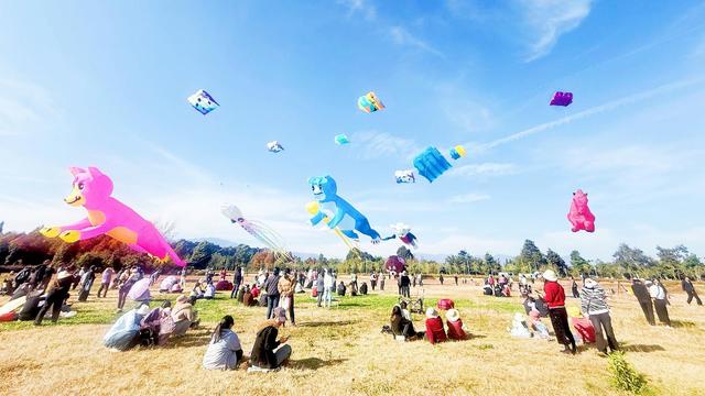 12月1日,抚仙湖畔的马房村湿地公园里热闹非凡,一群风筝爱好者齐聚于此放飞风筝。澄澈的湖水与湛蓝的天空相映成画,近10组形态各异的风筝借着微风舒展羽翼,在天际间铺展开一场趣味十足的“空中盛宴”。