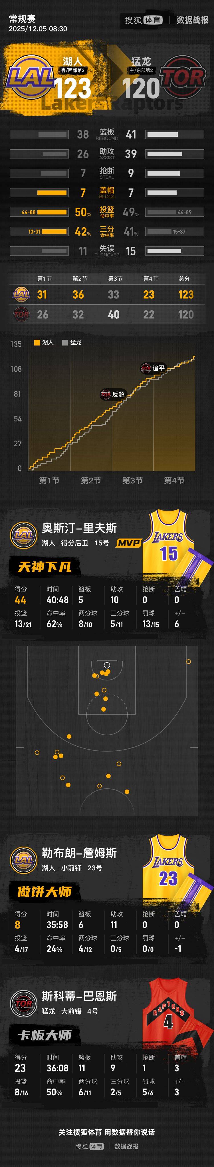 【搜狐体育战报】北京时间12月5日,2025-26赛季NBA常规赛继续进行,洛杉矶湖人客场挑战多伦多猛龙。全场打完,靠着八村塁绝杀三分球,湖人123-120险胜猛龙。