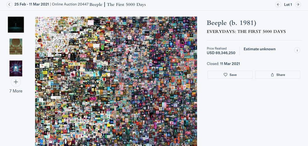 IT之家注:Beeple 创作的 JPEG 作品于 2021 年在佳士拍出 6930 万美元(现汇率约合 4.91 亿元人民币)。一位未透露姓名的买家获得了 Beeple 的《Everyday: The First 5000 Days,2007-21》,这幅数字拼贴画由艺术家自 2007 年以来在网上发布的所有图片组成。