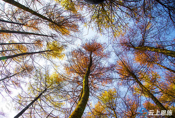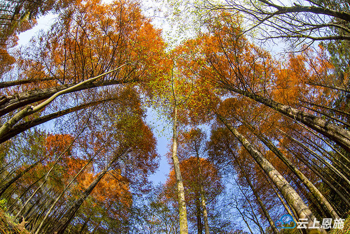云上恩施报道(通讯员 陈功龙 )12月5日,巴东县野三关镇铁厂荒林场,阳光斜穿杉林,洒下碎金般的光影。二十余万亩彩林绵延起伏,红枫似火、黄杉若金,松柏点缀其间,橙红叶浪与澄净蓝天相映成景。风过林梢,金红叶片簌簌飘落,铺就“彩毯”;行走间,轻碾的细响与风声交织,奏响初冬的自然序曲。