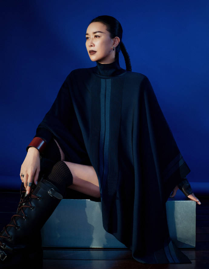 那英身着Hermès 2025秋冬女装系列第二篇章, 双面针织斗篷套装及皮革迷你裙,针织长袜搭配小牛皮长靴,佩戴皮革饰金属首饰与皮革手镯、针织皮革护腕,及CHAÎNE D' ANCRE系列银质手镯,柔软不失力量感,营造出女将的铿锵风范。