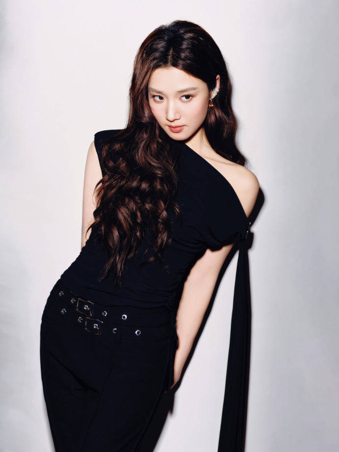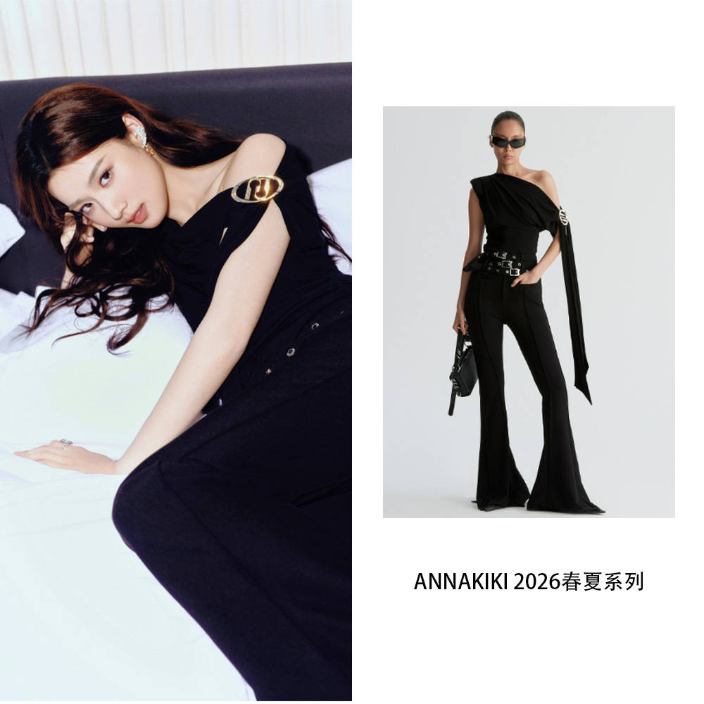 卢昱晓身穿Annakiki的黑色斜肩连体装,利落简约又不失细节的点缀,单边露肩+收腰”的组合,精准踩中了“性感不费力”的点,侧面飘带一垂,动态里全是松弛的时髦感;腰带的金属扣是视觉锚点,把简约款穿出了“贵价小众”那味儿。