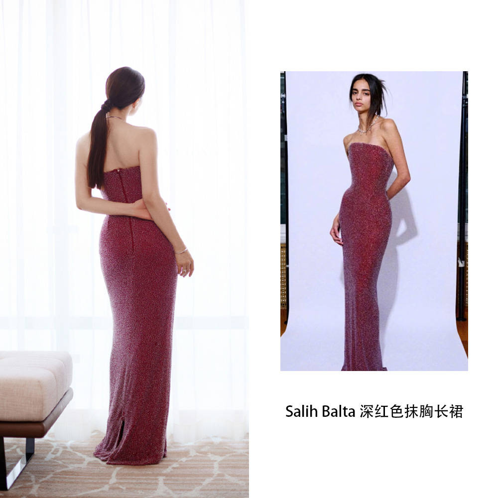 高圆圆身着Salih Balta深红色抹胸连身长裙,将身材线条的优美展现到极致,抹胸露肩+贴身剪裁,把明艳和性感揉得恰到好处,满铺的细闪面料彰显低调的华丽,灯光下会泛出细碎光泽的高级感。