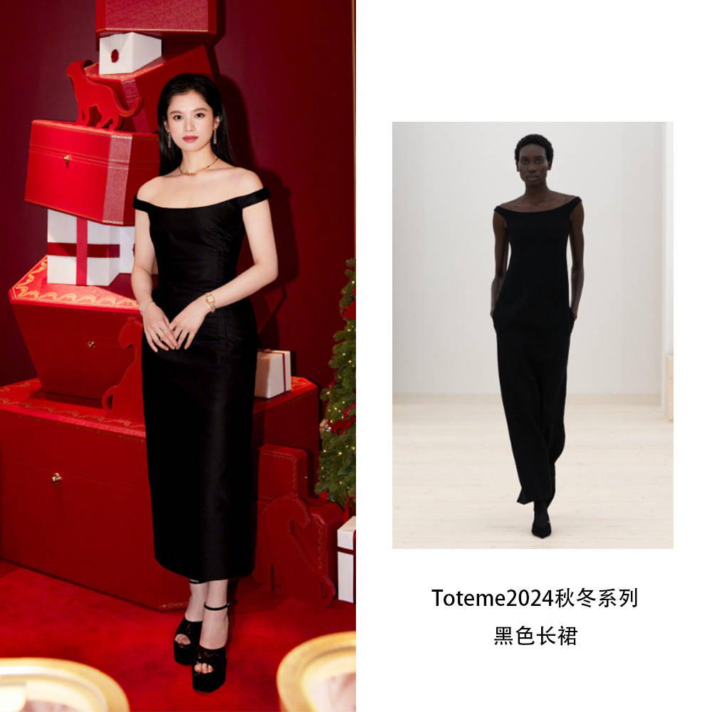 张婧仪一身Toteme的黑色一字肩长裙出席珠宝活动,大气简约,修身不紧身的剪裁,把曲线裹得恰到好处但不局促,缎面面料自带柔光滤镜,低调的贵气轻松彰显。