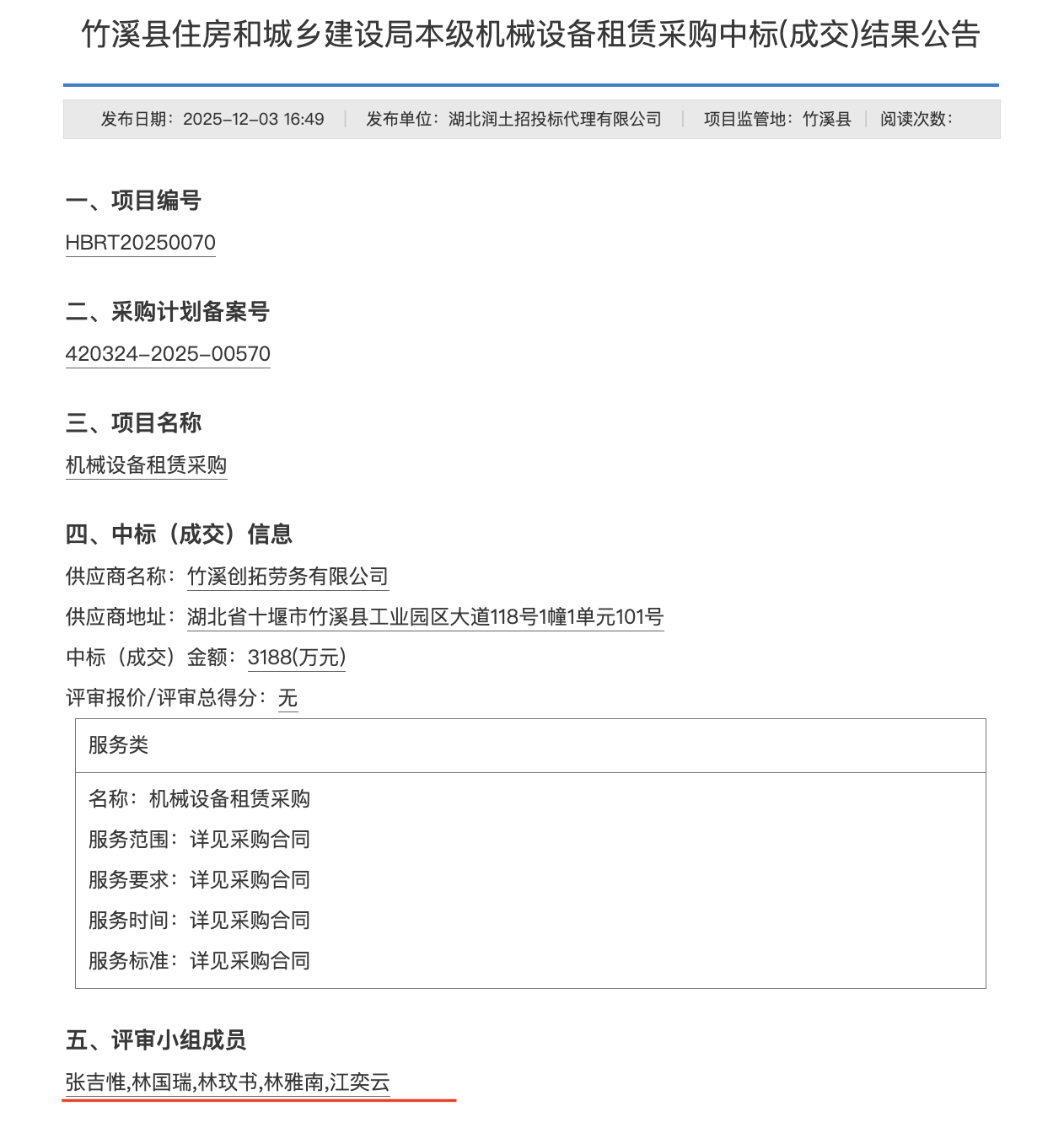 在“竹溪县住房和城乡建设局本级机械设备租赁采购中标(成交)结果公告”,评审小组五名成员与网络文档的前五个名字一致。 图源:中国政府采购网截图