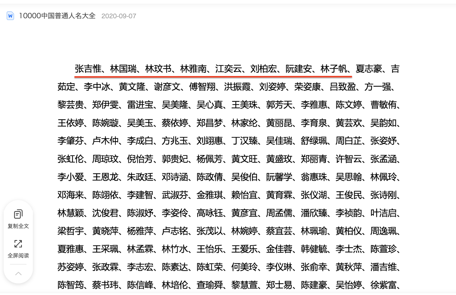 而在“10000中国普通人名大全”第一行中也有人名——“张吉惟、林玟书、林雅南、江奕云、刘柏宏、阮建安、林子帆”等,多个名字相似。