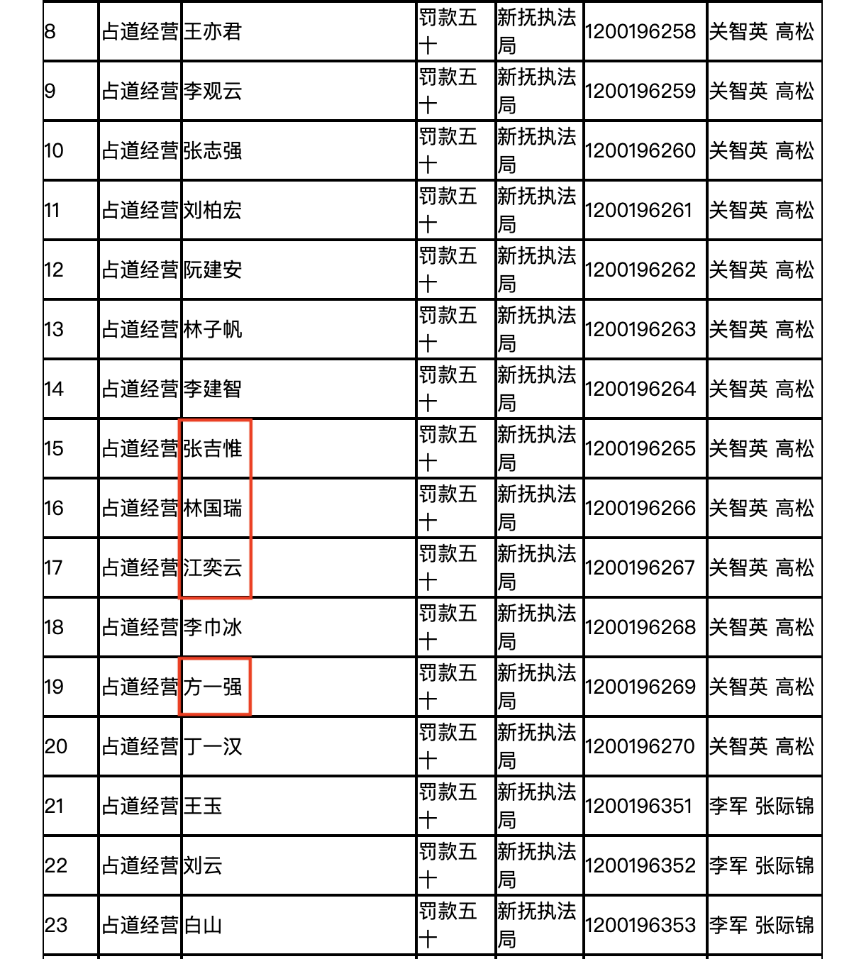 在那份公示中,“张吉惟、林国瑞、江奕云”等人因占道经营被罚款50元。通读名单后半部分的“刘千、王万、吕天、方天”,方灵越发觉得这些名字组合过于巧合,“像是编出来的。”