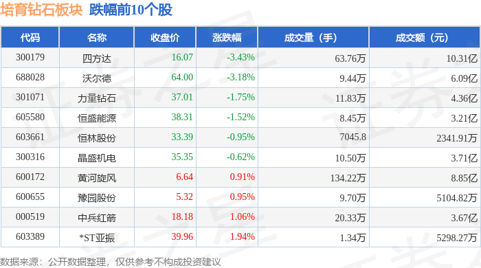 证券之星消息,12月5日培育钻石板块较上一交易日下跌0.2%,四方达领跌。当日上证指数报收于3902.81,上涨0.7%。深证成指报收于13147.68,上涨1.08%。培育钻石板块个股涨跌见下表: