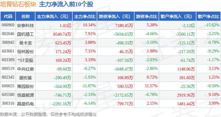 从资金流向上来看,当日培育钻石板块主力资金净流出4674.21万元,游资资金净流入1277.83万元,散户资金净流入3396.38万元。培育钻石板块个股资金流向见下表: