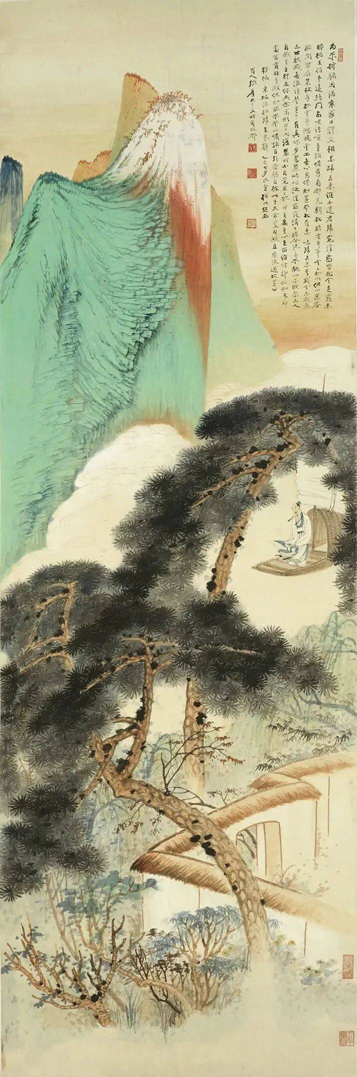 值得注意的是,张大千的“全球视域”并非对传统的背离。他在巴西八德园复刻中国园林,用农历、行传统礼仪;1979年朋友带回的家乡泥土让他放声大哭,此后供于家中;家书中“小园可以下榻,一切并如在内江”的表述,诗词中“看山须看故山青”的感慨,画作中《资中八胜》《蜀山图》等故乡题材,皆显露出对文化根脉的坚守。这种乡愁并非封闭的怀旧,而是转化为创作的精神动力——《杏花春雨图》中“春山锁江南”的意境,正是将个人记忆升华为人类共通的家园情怀。
