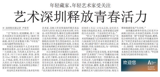 Hi21新锐艺术市集展位人流如织。看到心仪的作品,不少藏家积极询问价格。记者了解到,这是该艺术机构第七次参加艺术深圳。艺术品资深经纪人郭莹告诉记者,很多藏家在艺博会上往往更喜欢年轻艺术家的作品,这些更有新意、更具创造性的作品让人眼前一亮。“此次我们带来年轻艺术家的作品价格区间在1万元—2万元之间,定位在大家能买得起的艺术品,也希望通过这样的方式去培育一个良好的艺术生态。”