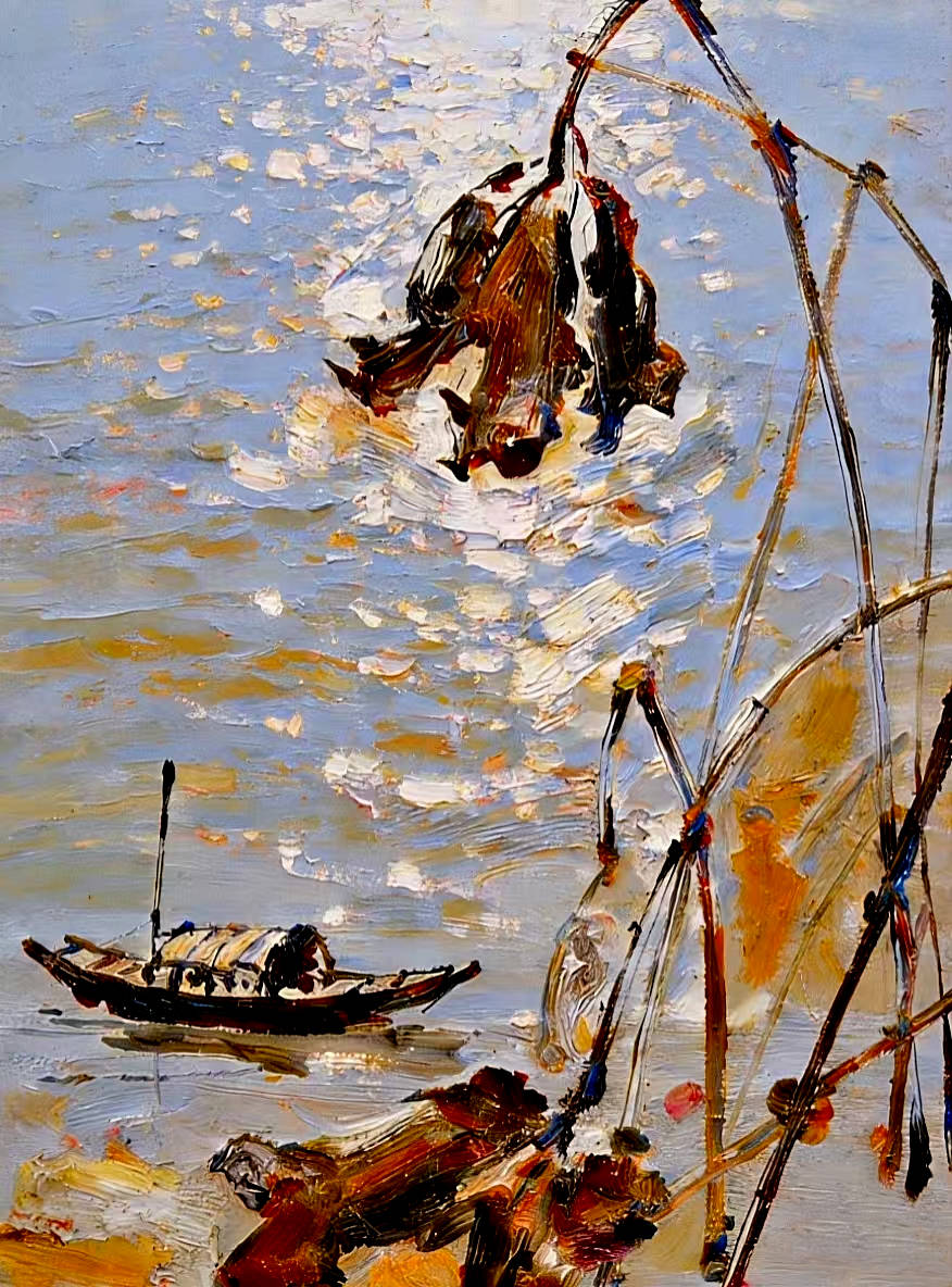 所以,这幅《秋塘泊舟》图,本质上是用当代艺术语言对中式美学进行的一次重新“翻译”。它既没有用油彩去生硬地模仿水墨的“形似”,也没有用传统符号去刻意地迎合西方的“新奇”,而是让油彩的厚重成为了东方诗意的“新载体”,让水墨的空灵成为了油彩肌理的“精神内核”,如同两种不同的文化元素在相互交融中焕发出新的生机与活力。