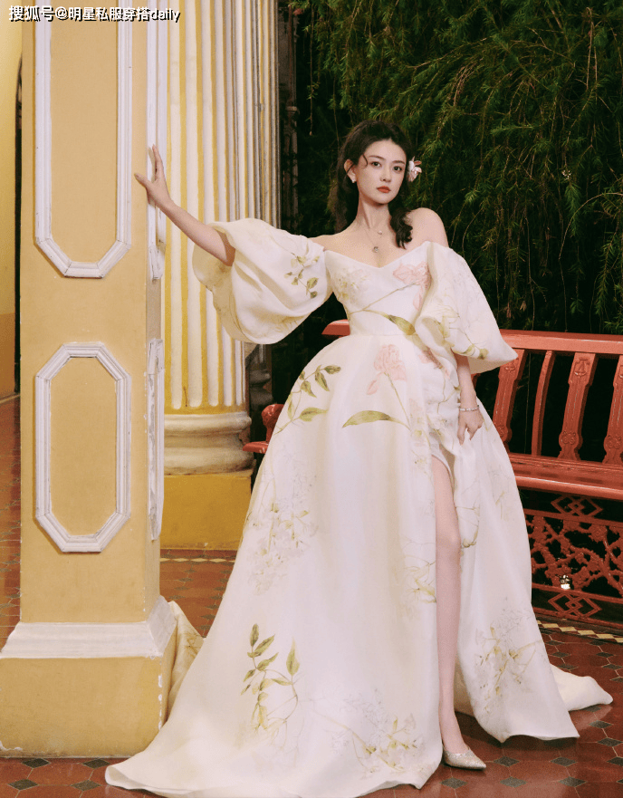 梁洁身穿一袭素雅的米白色收腰设计的一字肩抹胸长裙,泡泡袖设计和蓬松的裙摆,梦幻十足!而高开叉设计的半身长裙,露出纤细的长腿,则增加了穿搭的性感气质!
