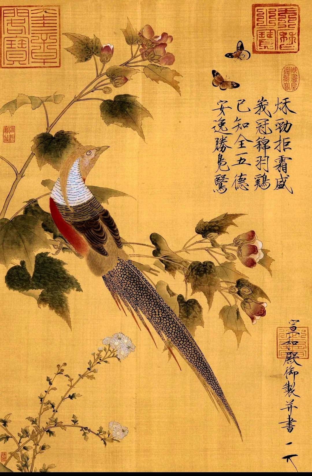 《芙蓉锦鸡图》便是这份追求的极致体现。画面中,锦鸡立于芙蓉枝上,姿态灵动,眼神锐利,羽毛的纹理细腻逼真,甚至能让人感受到其蓬松的质感;芙蓉花娇艳盛放,花瓣的层次与光影处理精妙,露珠欲滴,尽显生命活力。宋徽宗并未在画作中刻意彰显帝王权威,而是以平等的视角观察自然,以细腻的笔触还原物象本真。他的书法题跋 “秋劲拒霜盛,峨冠锦羽鸡。已知全五德,安逸胜凫鹥”,既点明了画面主旨,又与绘画意境融为一体,展现出 “诗书画印” 结合的艺术匠心。这种创作没有丝毫功利算计,纯粹是对自然之美、艺术之美的赤诚表达,正如他在《宣和画谱》中所言:“画者,文之极也”,将绘画提升到了精神追求的至高层面。