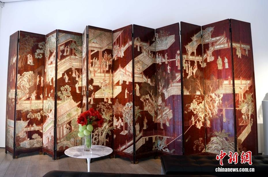 当地时间12月6日,巴黎佳士得亚洲艺术周拉开帷幕,展示即将拍卖的各种珍品。图为其间展示的清康熙年间款彩庭院人物图十二扇屏风。中新社记者 李洋 摄