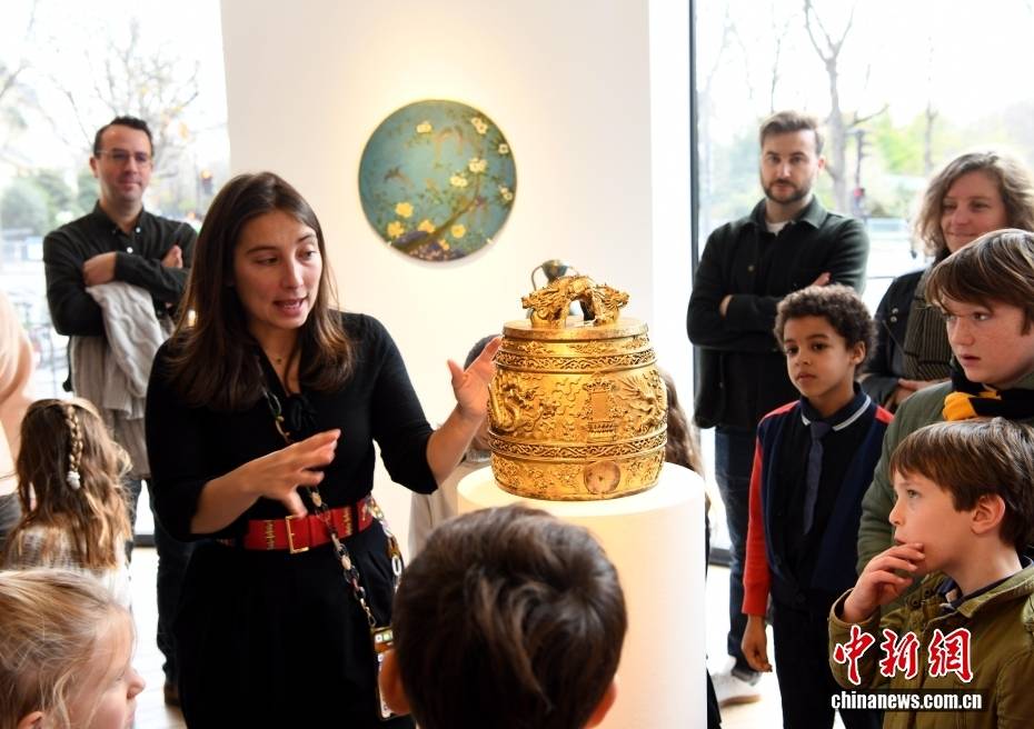 当地时间12月6日,巴黎佳士得亚洲艺术周拉开帷幕,展示即将拍卖的各种珍品。图为工作人员讲解正在展示的清乾隆年间御制铜鎏金交龙钮云龙赶珠纹“倍南吕”编钟的艺术特色。中新社记者 李洋 摄