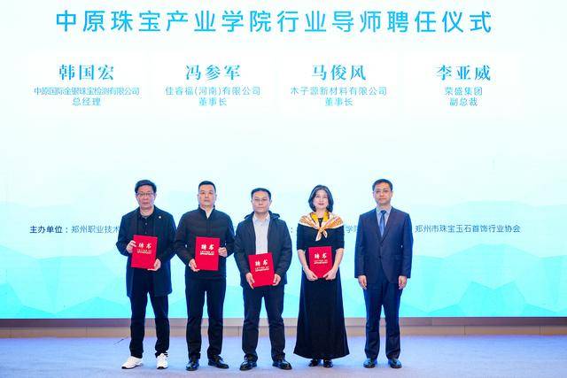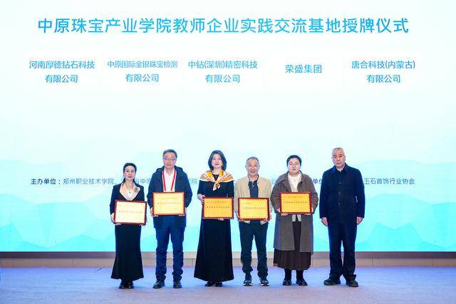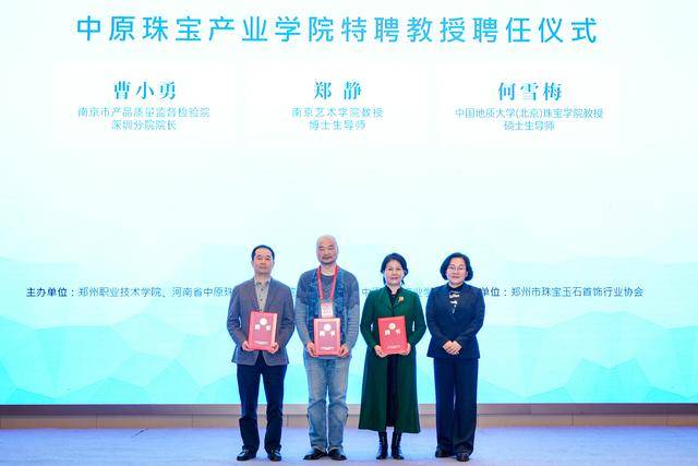 特聘教授与行业导师聘任:南京艺术学院郑静教授、中国地质大学(北京)何雪梅教授、南京市质检院深圳分院曹小勇院长受聘为中原珠宝产业学院特聘教授;荣盛集团副总裁李亚威等四位行业专家受聘为行业导师。