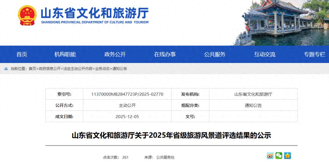 根据《旅游风景道等级划分》和《山东省旅游风景道评定工作方案》,开展省级旅游风景道评选工作,经各市文化和旅游部门自评申报、专家评审等环节,2025年新增省级旅游风景道21段,现将名单予以公示(见附件1)。公示期自2025年12月8日至12月12日。
