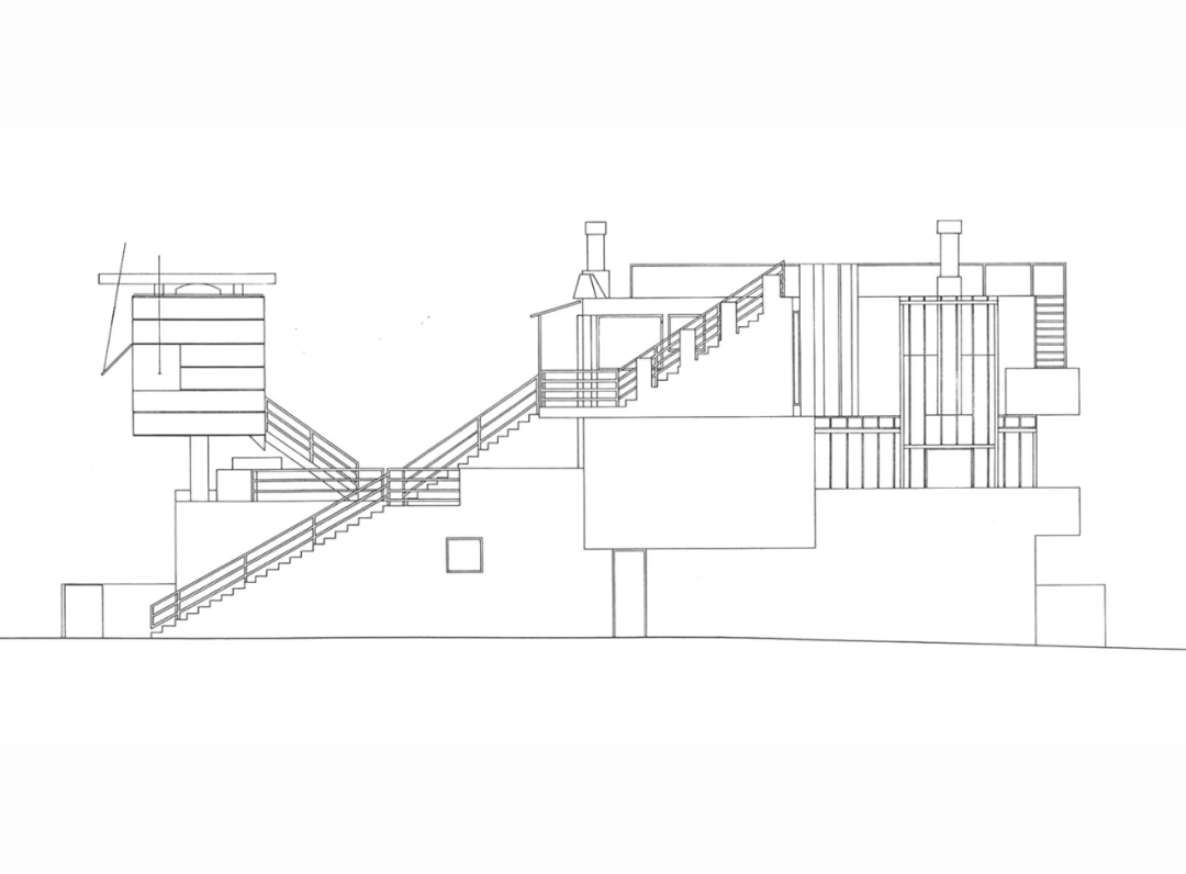 住宅的一大特色是“高架小工作室 (studio)” 像救生员塔 (lifeguard-stand) 那样矗立在前面,用于俯瞰大海和沙滩,呼应房主曾是救生员的身份。
