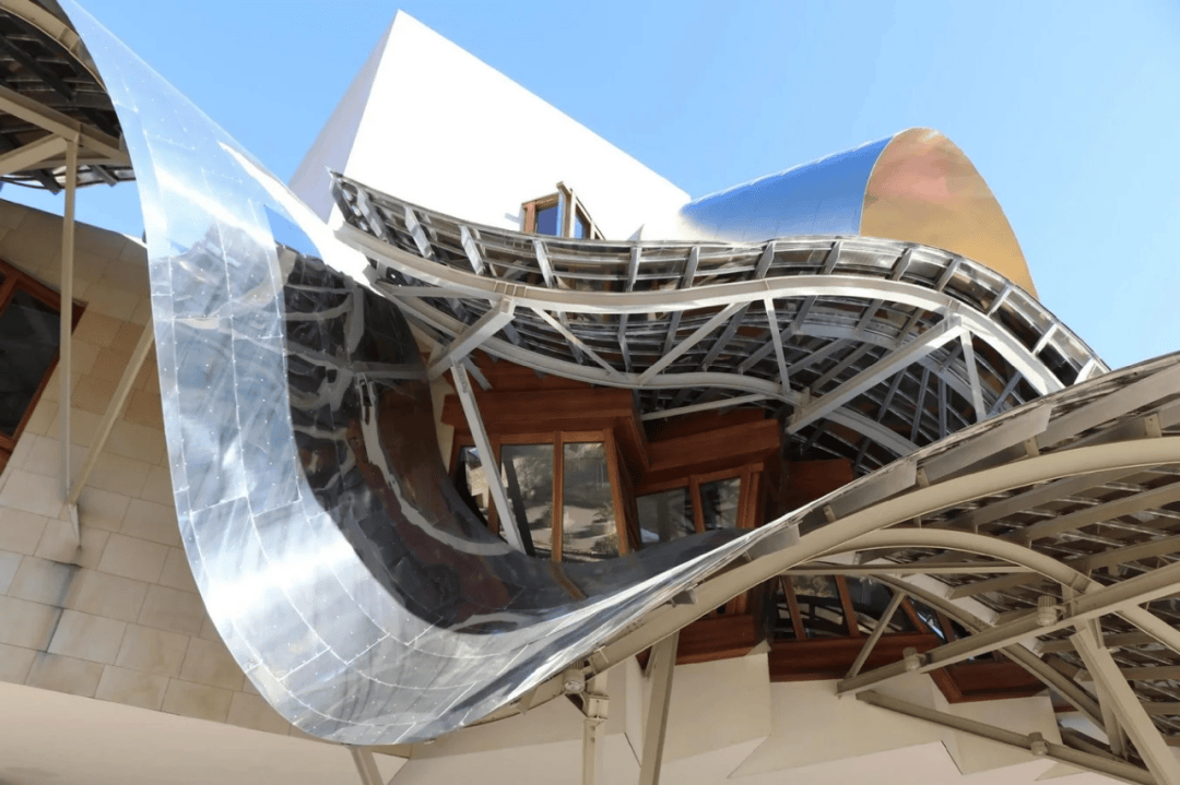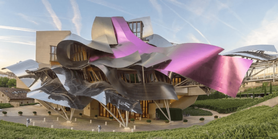 Marqués de Riscal 酒庄是弗兰克·盖里在葡萄酒文化建筑上的代表作。建筑以不锈钢和钛金属曲面打造出如丝带般缠绕的屋顶,色彩鲜明、线条流动,象征葡萄酒液体的律动和葡萄园的延展。