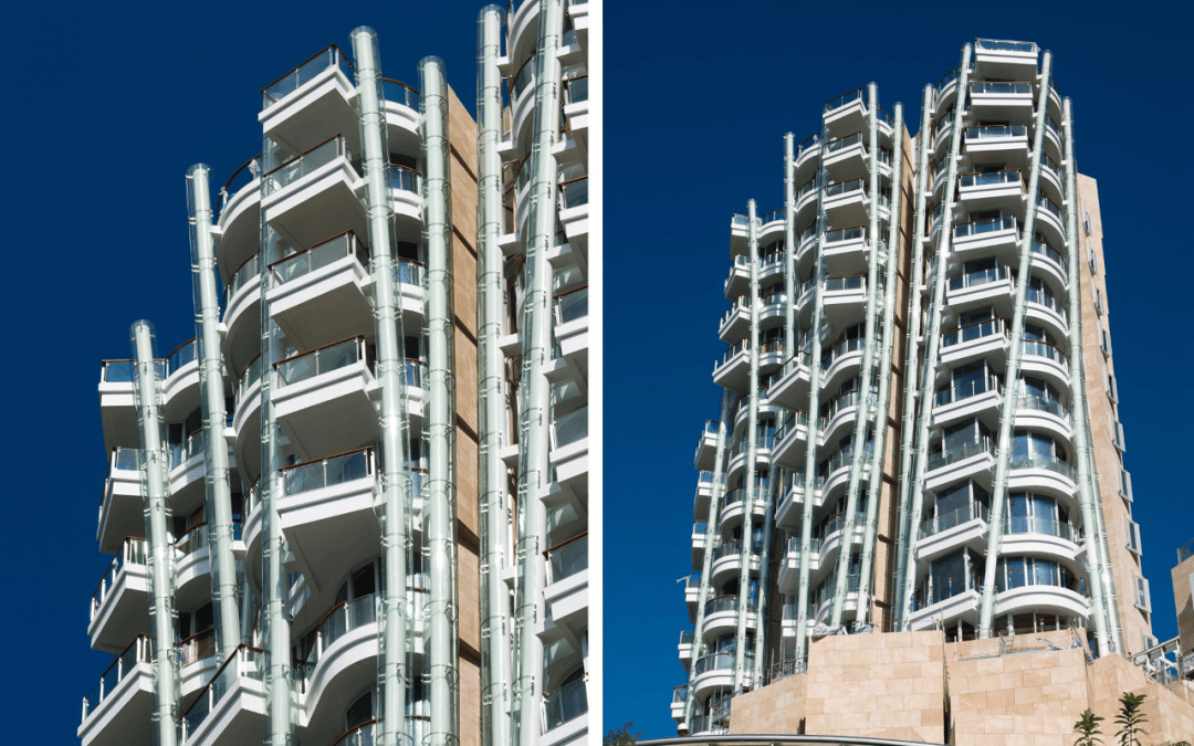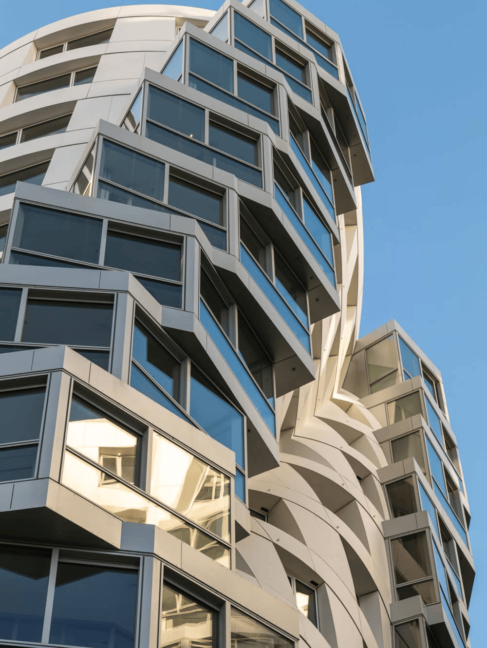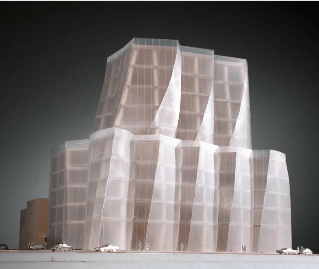 它是盖里将他典型的解构主义、雕塑化语言,应用到城市高层住宅中,褶皱、波动的金属立面,使建筑看起来如同“流动的雕塑”。