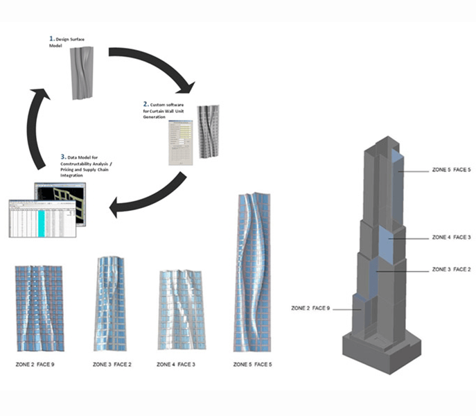 建筑最大的特点是螺旋式扭转的外形以及玻璃包裹的结构柱,使楼体呈现轻盈、流动的雕塑感,同时让室内几乎没有承重墙,形成通透的开放式布局。