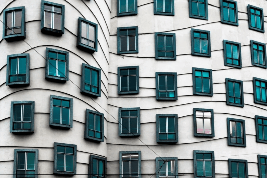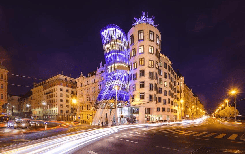 这座建筑因其动感、不规则的轮廓被称为“舞动的房子 (Dancing House)”,像两位舞者在河畔拥抱。