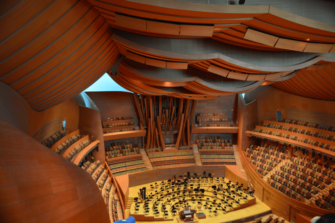 内部 auditorium 以其独特造型与优秀声学效果闻名,是公共文化建筑与雕塑建筑融合的典范。
