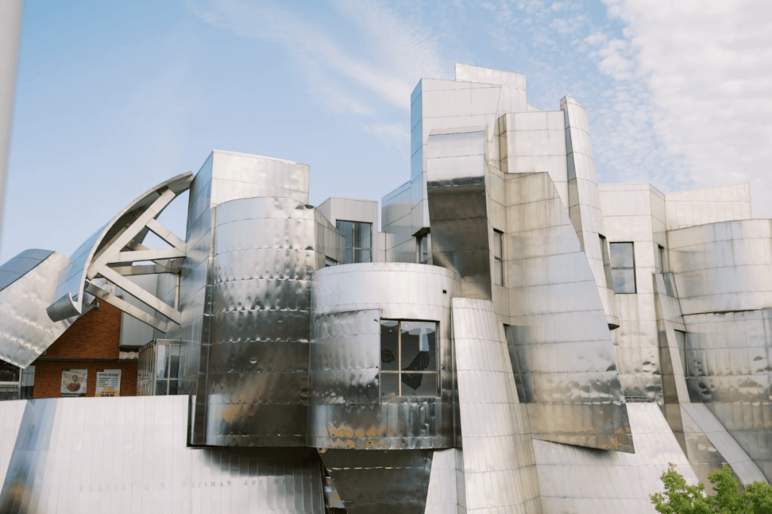 威斯曼艺术博物馆(Weisman Art Museum)于 1993 年在明尼苏达大学校园内落成,是弗兰克·盖里在金属曲面语言成熟前的重要节点作品。建筑以不锈钢板构成的折叠体量为最大特色,几何块体像被光线雕刻般交错堆叠。