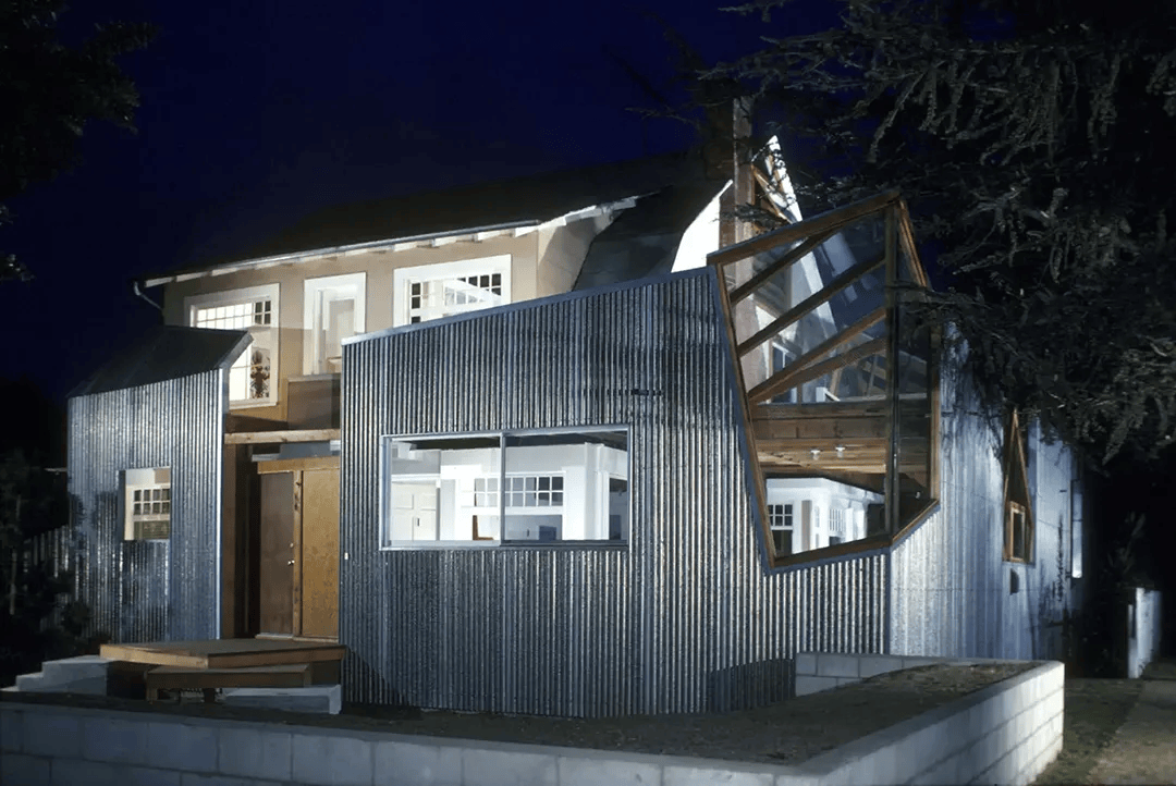 这是盖里为自己和家人改造的住宅。原本是一栋 1920 年代 “Dutch Colonial” 风格的住宅,盖里用金属、胶合板、铁丝网 (chain-link) 等非常规材料对其进行“包裹、扭曲、扩展”。