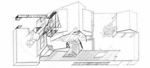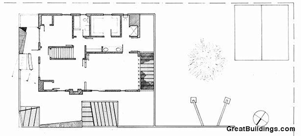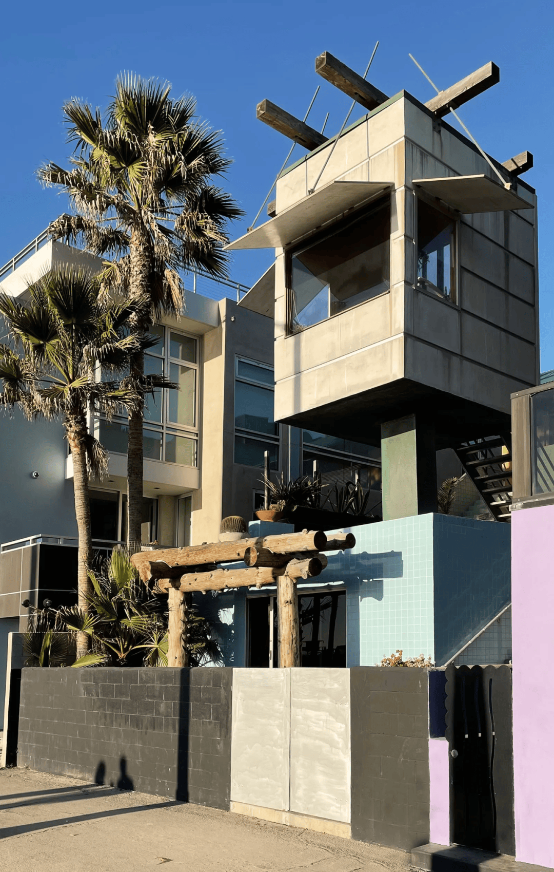 这是盖里为艺术家/作家 (William & Lynn Norton) 设计的海滨住宅。地处窄小的海滨地块,他采用拼贴式 (collage) 的设计,把不规则的体量、不对称的空间和多种材料,混凝土块 (concrete block)、stucco、瓷砖 (tile)、木头 (timber) 等混合起来。