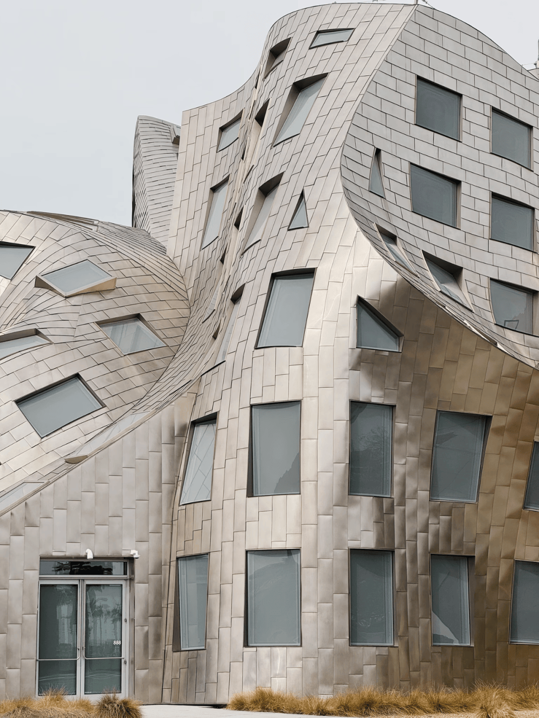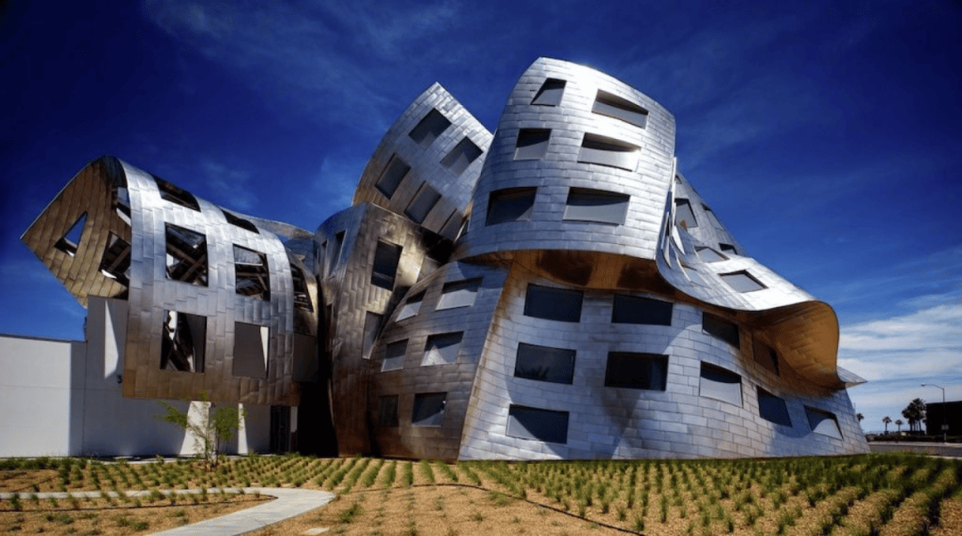 这是弗兰克·盖里设计的神经健康研究与康复中心,建筑以不规则曲面和错落的钢板立面为最大特色,仿佛大脑结构在空间中扭曲折叠,象征神经网络的复杂性。