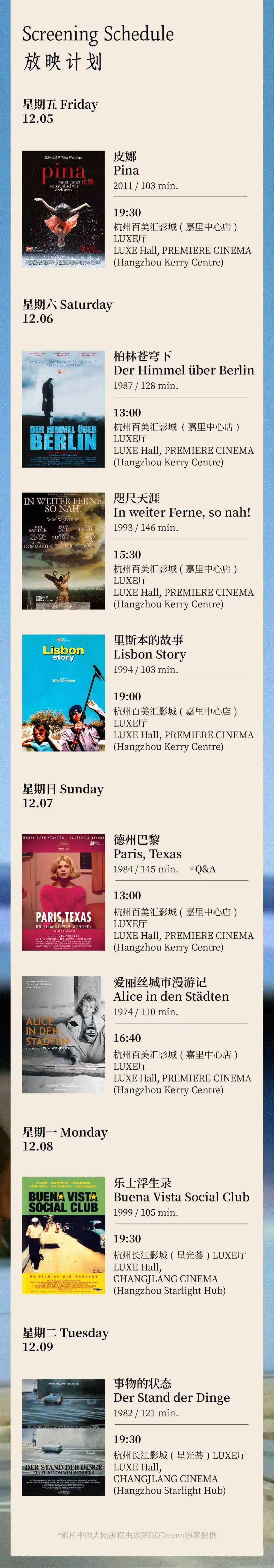 12月5日至9日,由中国美术学院电影学院联合浙江省电影放映协会,并与北京德国文化中心·歌德学院(中国)协力,推出“观看的行为:文德斯电影精选展”。本次影展将在杭州集中呈现维姆·文德斯导演的8部代表作品,导演本人也将亲临《德州巴黎》映后现场与观众对话。