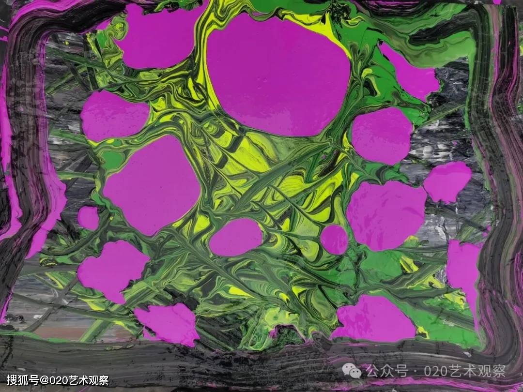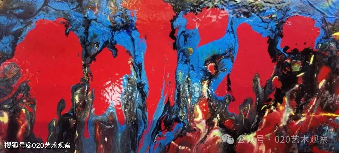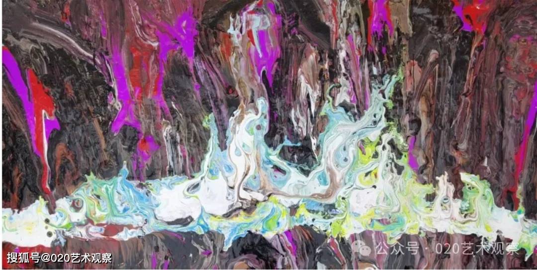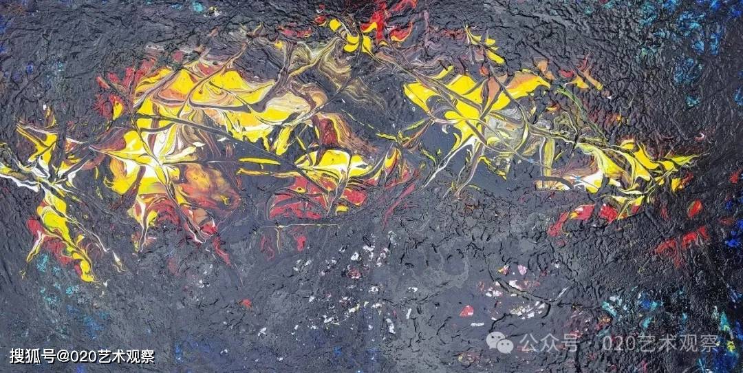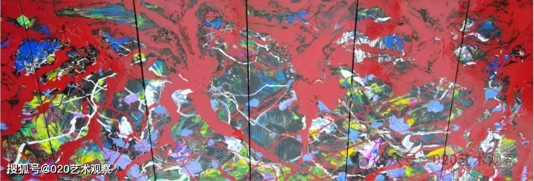 这几年他在艺术上投入的时间更多,变化令人惊叹。通常,他作画前先凝视画布良久,默默打着腹稿;突然拎起颜料桶开始泼向画布,同时间倒入其它配色,墨汁是逃脱不了的介质,当颜料混合了墨汁、各方向移动画布;颜料混合流淌,此时或拿起拖把、或横卧板刷,开始刮扫,须臾,思考—刮洒—涂抹,往复多次直至满意方可结束。整个过程一气呵成,如一次行为表演,作画者此时身入其境、观看者身心皆爽。一次他刚泼洒、刮扫完毕,我正好到了工作室,但见刮扫的颜料如岩浆流淌地面,心中好不惋惜,我想,他应该是颜料商最喜欢的人。