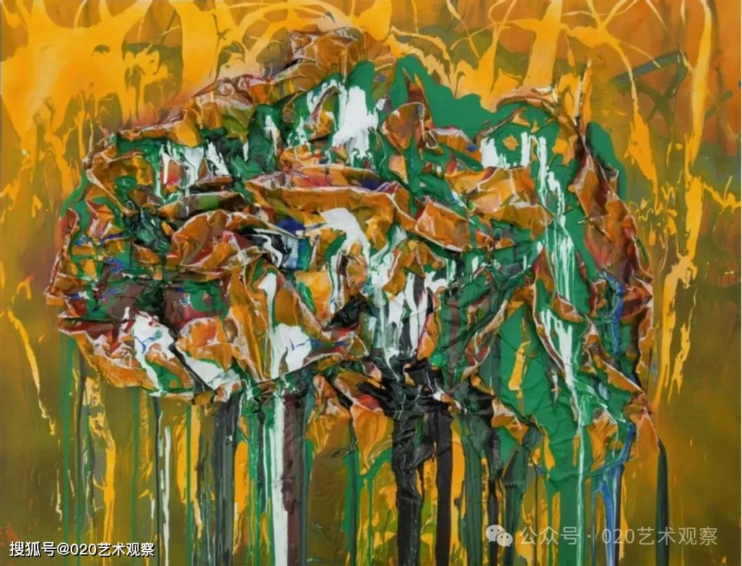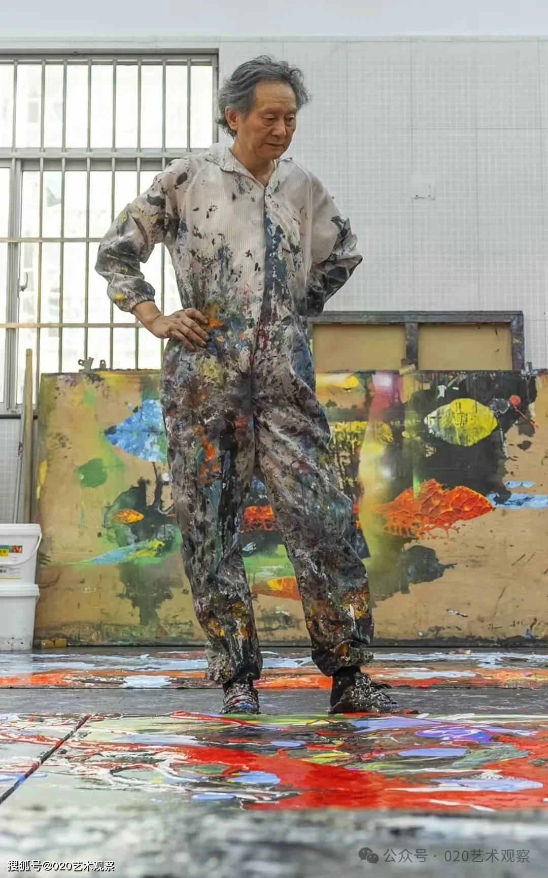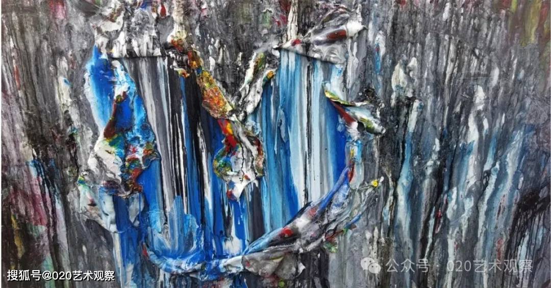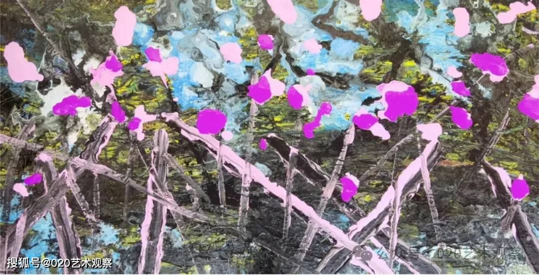 这几年他在艺术上投入的时间更多,变化令人惊叹。通常,他作画前先凝视画布良久,默默打着腹稿;突然拎起颜料桶开始泼向画布,同时间倒入其它配色,墨汁是逃脱不了的介质,当颜料混合了墨汁、各方向移动画布;颜料混合流淌,此时或拿起拖把、或横卧板刷,开始刮扫,须臾,思考—刮洒—涂抹,往复多次直至满意方可结束。整个过程一气呵成,如一次行为表演,作画者此时身入其境、观看者身心皆爽。一次他刚泼洒、刮扫完毕,我正好到了工作室,但见刮扫的颜料如岩浆流淌地面,心中好不惋惜,我想,他应该是颜料商最喜欢的人。