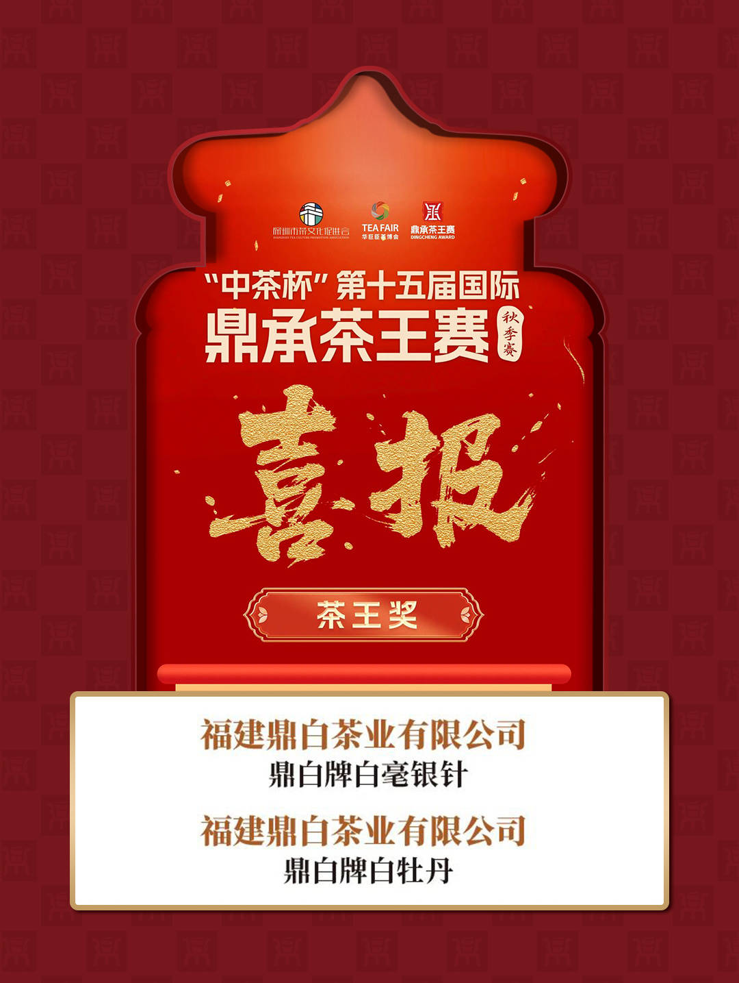 在近期收官的"中茶杯"第十五届国际鼎承茶王赛·秋季赛中,鼎白茶业再次以其卓越品质,旗下鼎白牌白毫银针与鼎白牌白牡丹双双荣获茶王奖,同时白毫银针摘得特别金奖,白牡丹获得金奖,共计四大奖项,成为本届赛事最大赢家之一。