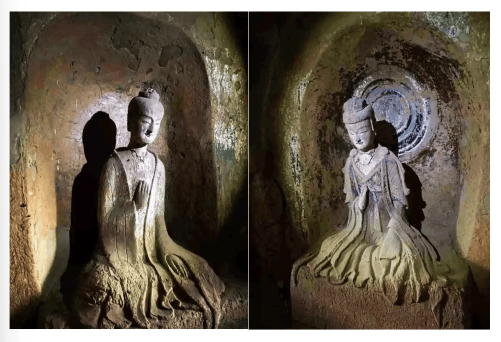 麦积山的123号窟,开凿于西魏时代,也是《维摩诘经变》窟,维摩诘居士和文殊菩萨对坐论辨,均作结跏跌座。文殊高1.20米,戴冠,双目下垂,束腰带,衣摆自然下落,右手上举,左手随意置于腿上,彩绘了同心圆头光。维摩诘高1.22米,头梳小髻,身穿宽博外衣,左手放在腿部,右手当胸上举。这是麦积山123窟的独特之处——文殊和维摩应出自同一艺术家之手,他们的一体感雕塑得惟妙惟肖,一目了然;内在的神韵高度一致,仿佛就是一个人的一体两面,令人想起经中,文殊菩萨和维摩居士的对话同一旨趣。