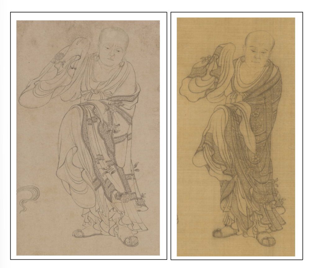 《维摩演教图》和《维摩不二图》虽出于不同的时代,现在也在不同的展馆,却连结构、人物设置都一模一样,只是文殊菩萨的面相不同,一无胡须一有胡须;舍利弗身上的袈裟不同,着色一浅淡一浓厚;韦陀菩萨的表情不同,一少壮一苍老;可见,隔代有知音,艺术家代代心慕手追,以临摹的方式致敬前代佳作,确有其人其事。
