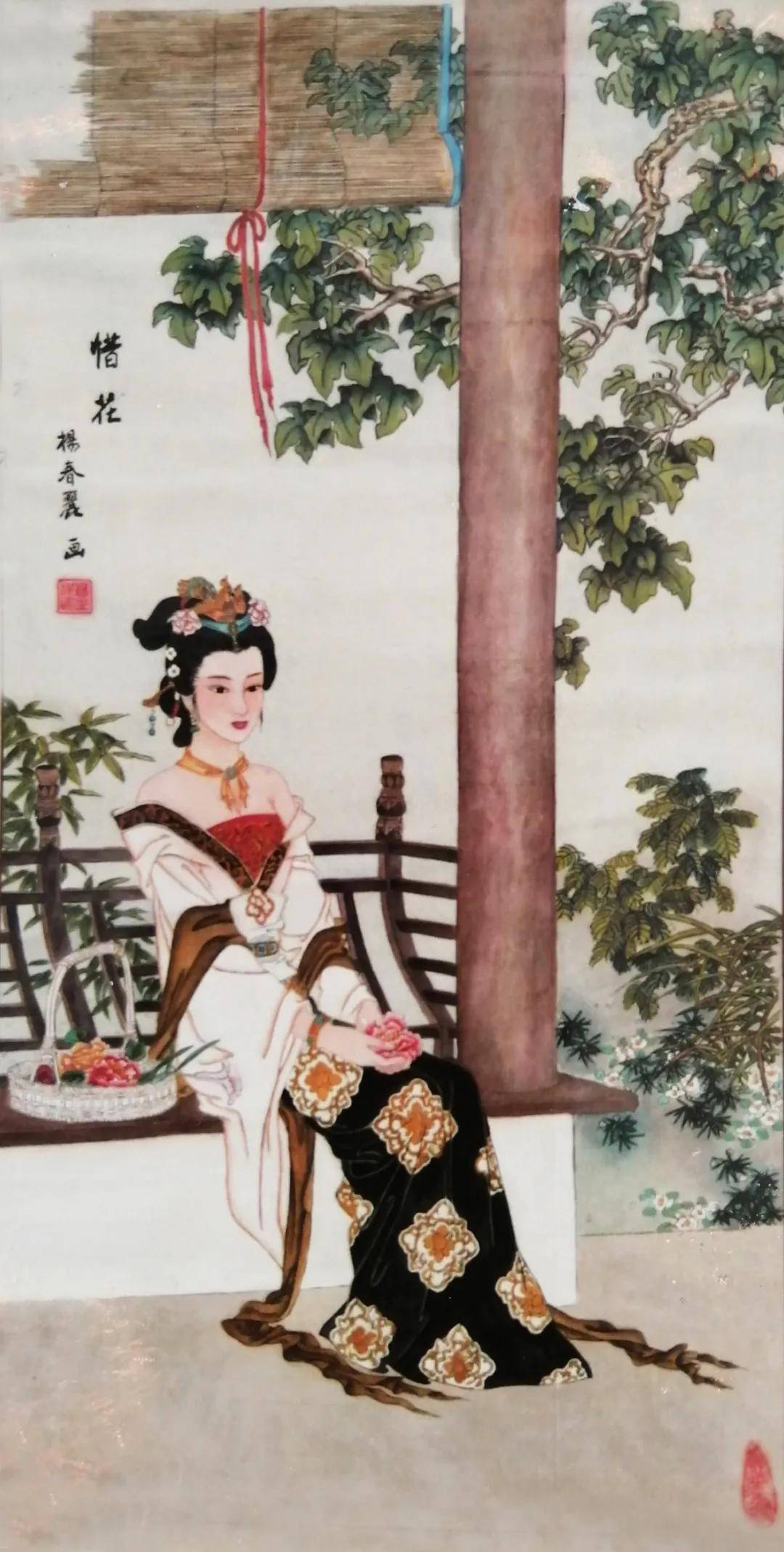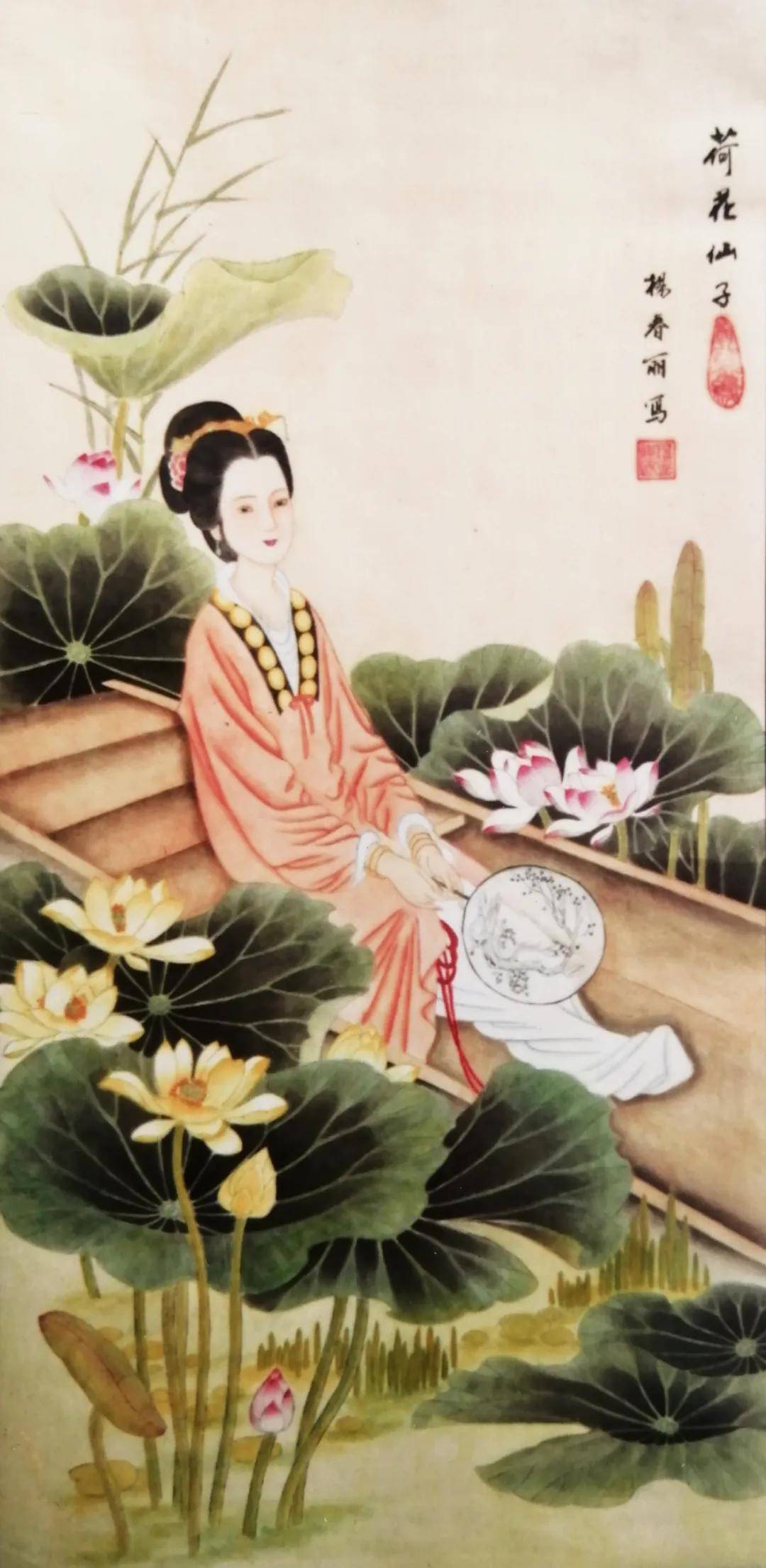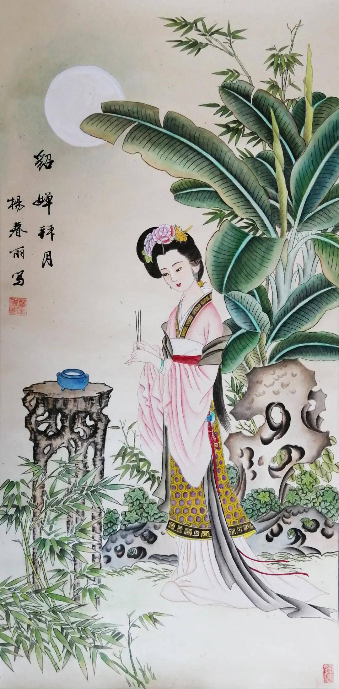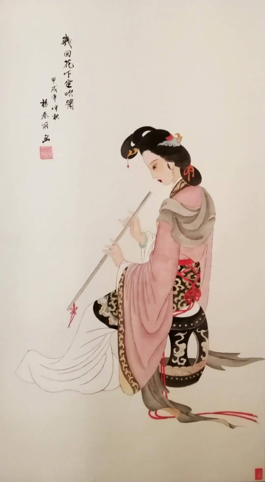 在丹青世界里,她尤钟情于传统仕女画,笔下的佳人似从唐诗宋词中走来——或执纨扇凭栏,衣袂翩跹若惊鸿照影;或低眉抚琴,指尖流淌着千年清韵。曾潜心临摹彭连熙、项维仁、杨淑涛等诸多名家作品,如蜜蜂采撷百花之精,终酿就自家风骨。经名家点化后,其画作更添三分神韵,七分风骨,绢素间的仕女仿佛被注入了生命,一颦一笑皆可倾国。