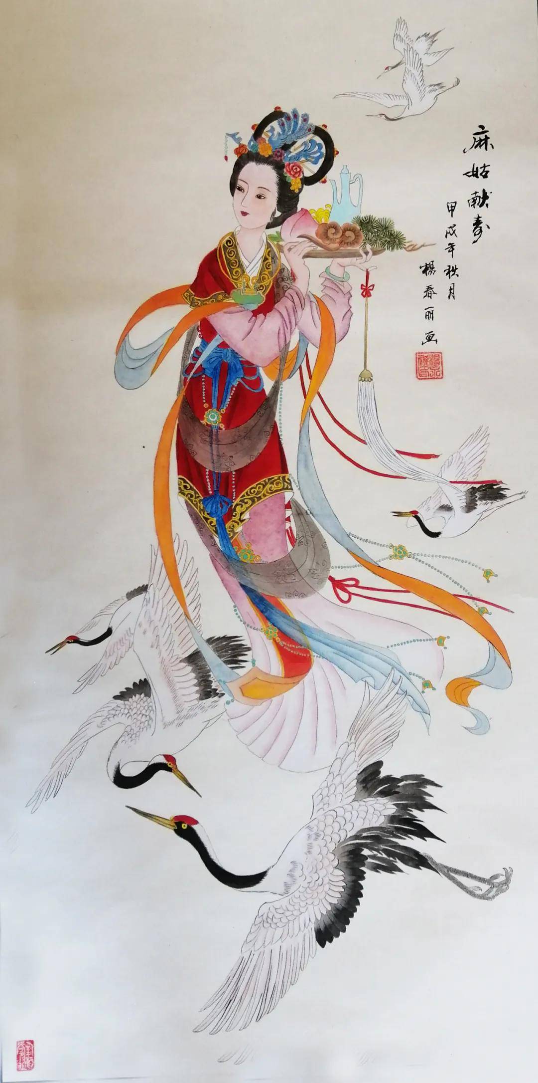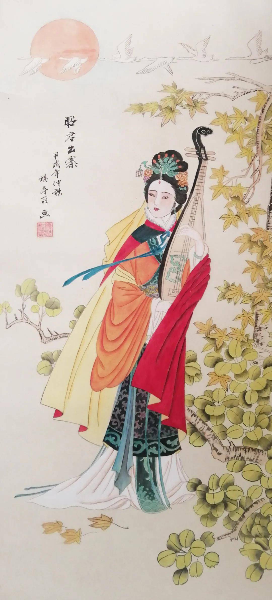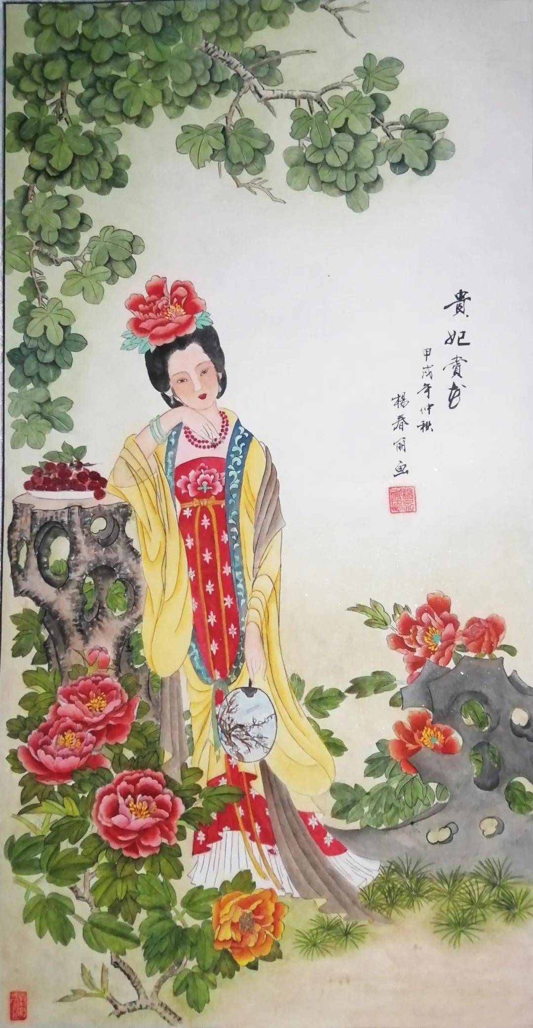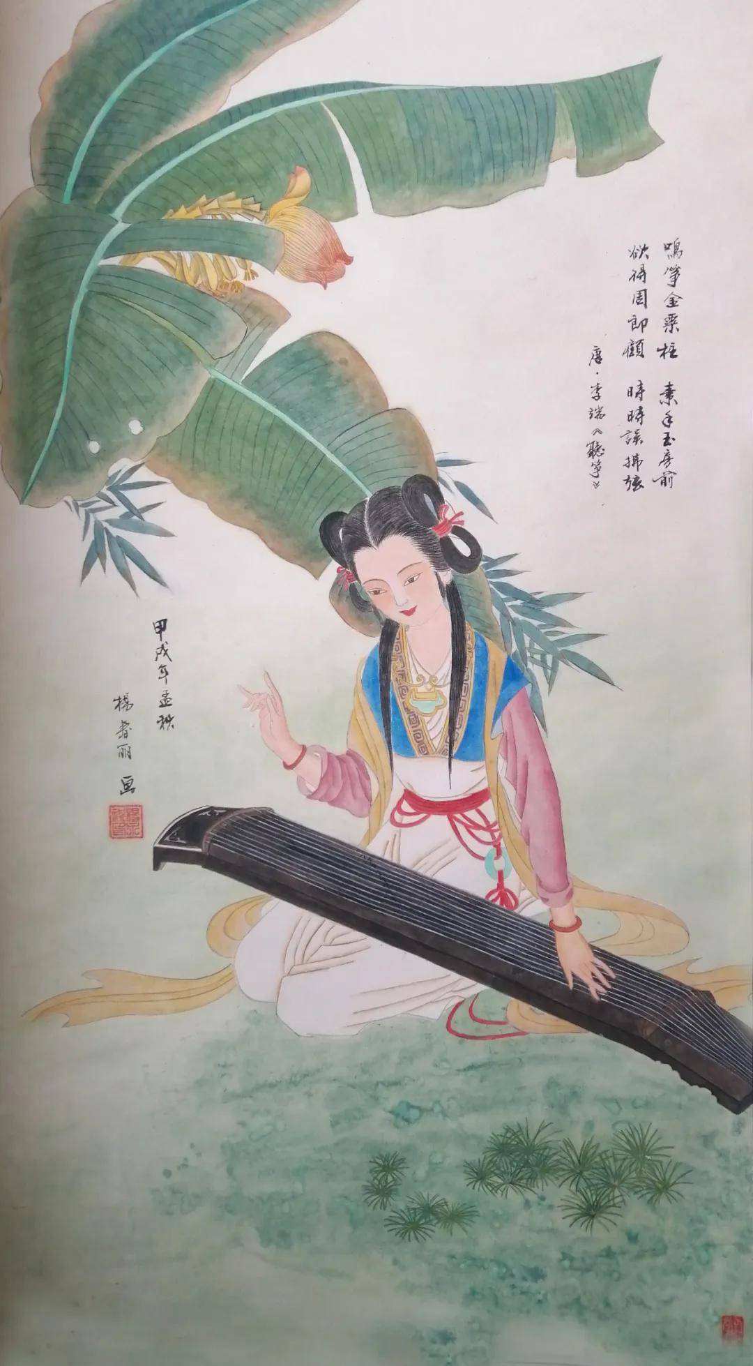 在丹青世界里,她尤钟情于传统仕女画,笔下的佳人似从唐诗宋词中走来——或执纨扇凭栏,衣袂翩跹若惊鸿照影;或低眉抚琴,指尖流淌着千年清韵。曾潜心临摹彭连熙、项维仁、杨淑涛等诸多名家作品,如蜜蜂采撷百花之精,终酿就自家风骨。经名家点化后,其画作更添三分神韵,七分风骨,绢素间的仕女仿佛被注入了生命,一颦一笑皆可倾国。