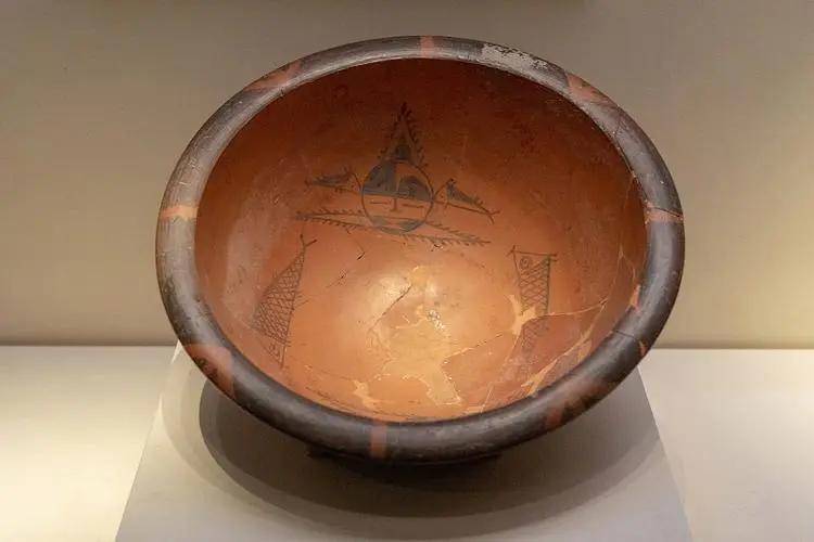 现藏于中国国家博物馆的人面鱼纹彩陶盆是新石器时代仰韶文化的彩陶珍品。虽名为"盆",但实际上是一件儿童瓮棺的棺盖。人面鱼纹彩陶盆通高16.5厘米,口径39.8厘米,敞口卷唇,细泥红陶质地。盆内壁以黑彩绘出两组对称的人面鱼纹。其构图手法大胆夸张。人面成圆形,头顶上三角形发髻高耸,加上鱼鳍形的装饰,显得威武华丽。额的左半部涂为全黑,右半部下为黑色半弧形,上面留出弯镰形的空白,或许是当时的文面习俗。眼睛细而平直,鼻梁挺直,神态安详,嘴旁分置两个变形鱼纹,鱼头与人嘴外廓重合,加上两耳旁相对的两条小鱼,构成形象奇特的人鱼合体,表现出丰富的想象力。在相对的人面之间还有两条大鱼同向追逐,鱼身及鱼头均呈三角形,圆形鱼眼,虽寥寥几笔,却把鱼的形神勾画得具体而细微,斜方格鱼鳞,富有律动感,充满了生气。整体图案显得古拙,简洁而又奇幻,怪异。