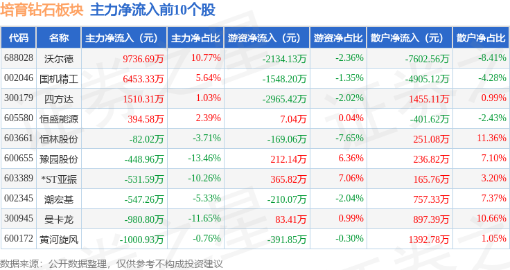 从资金流向上来看,当日培育钻石板块主力资金净流出2566.65万元,游资资金净流出5854.66万元,散户资金净流入8421.31万元。培育钻石板块个股资金流向见下表: